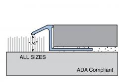 Description: Great Lakes Carpet Tuck ADA Compliant Trim. An excellent choice to transition from tiled flooring to a tight piled carpet. 8' Length; 5/16", 3/8" or 1/2" Height. Choose from 6 finishes. (Some finishes not available in all sizes). Made in the USA.