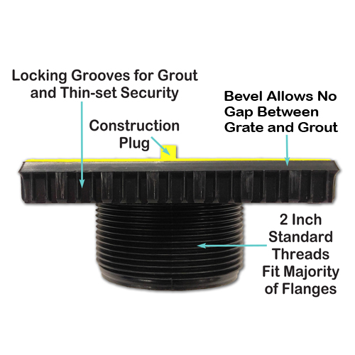 Description: 4" Square Drain Riser for PSC Pro Generation 2 Shower Drain System. 4" Square Riser. Turns a Round Drain into a Square Drain for easy tiling. Fits into 2" PVC or ABS Drain. Comes with Hair Trap and square Construction Plug.