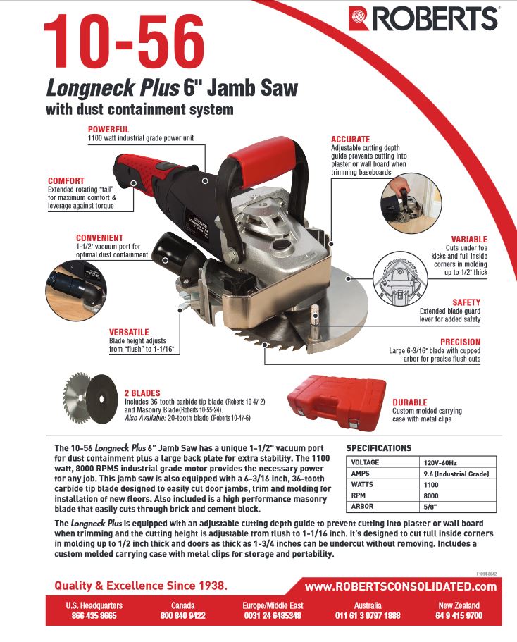 Description: Roberts 10-56 Long Neck Plus 6 Inch Jamb Saw replaces 10-55. Extended tail for maximum leverage against torque. Powerful, 1100 watt 120 VAC industrial grade power unit. New! 1-1/2" Vacuum port. Includes 6" jamb saw 10-56, 36-tooth carbide tip blade 10-47-2, and masonry blade 10-55-24. Cuts molding up to 1/2 in. thick.